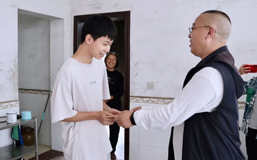 来到嘉豪家里的时候,嘉豪妈妈热情地招呼志愿者们坐下喝茶,她分享着孩子考上大学的喜悦、求学的时期的努力和辛苦。相比妈妈的热情,嘉豪显得文静又腼腆。胡国安董事长为嘉豪送上了爱心助学金和生活用品,他鼓励嘉豪打开自己的世界,上了大学以后要更开朗一点,在学校多跟老师同学交流,多交点朋友,多走出去看看世界,丰富自己。和人生一样,崎岖的山路困不住每一个努力的人,当你真正走出去,会发现外面的世界更加广阔和精彩。嘉豪认真地点了点头。聊天过程中,嘉豪奶奶拿着开水瓶,挨个问着志愿者们要不要添点茶水。老人年纪大了,脚步也有点蹒跚,但脸上一直挂着灿烂的笑容。嘉豪父母一个长期在外务工,一个忙于操劳家务和农活,这么久以来,难得因为嘉豪考上大学让一家人团聚,每个人都心生欢喜和希望。或许未来还有很长的路要走,但嘉豪的大学录取通知书给每一个人都带来了更多面对生活的底气和信心。一家人已经看到了一条走出大山的路,嘉豪也将努力带着家人的期盼从这条路走向幸福和光明的未来。