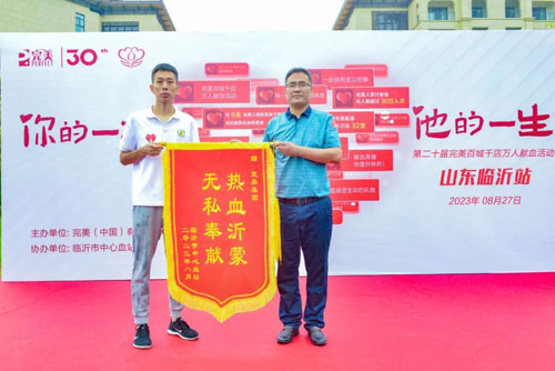 临沂市中心血站副站长万明光向完美山东分公司颁发了“热血沂蒙,无私奉献”锦旗,并对完美公司多年来积极参与无偿献血活动表示赞扬和感谢。