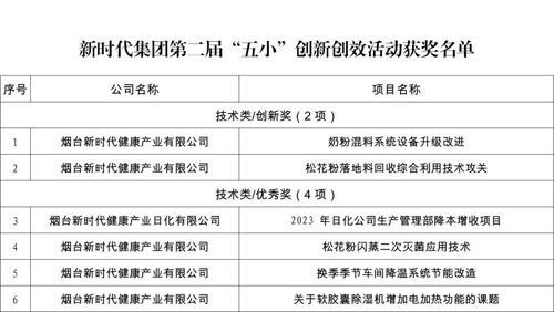 为深入贯彻落实新时代集团产业工人队伍建设改革工作要求和“能力提升年”工作部署,不断提升职工队伍能力素质,激发“全员创新”活力,今年,新时代集团组织开展了第二届“五小”创新创效活动,评选出一大批优秀“五小”创新成果。根据《中国新时代控股集团有限公司“五小”创新创效活动管理办法》相关规定,经评审小组评议,授予烟台新时代健康产业有限公司《奶粉混料系统设备升级改进》、《松花粉落地料回收综合利用技术攻关》2 个项目技术类“创新奖”;授予烟台新时代健康产业日化有限公司《2023 年日化公司生产管理部降本增收项目》、烟台新时代健康产业有限公司《松花粉闪蒸二次灭菌应用技术》《换季季节车间降温系统节能改造》《关于软胶囊除湿机增加电加热功能的课题》4 个项目技术类“优秀奖”。
