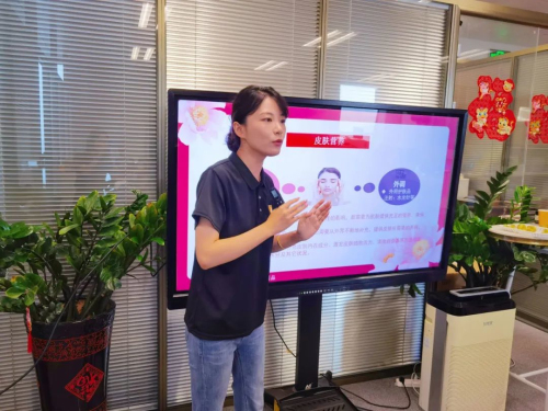 活动开始,分公司员工陈舒妮为大家带来新品丹凤水光臻双肽饮品和花现升级版产品的详细讲解。