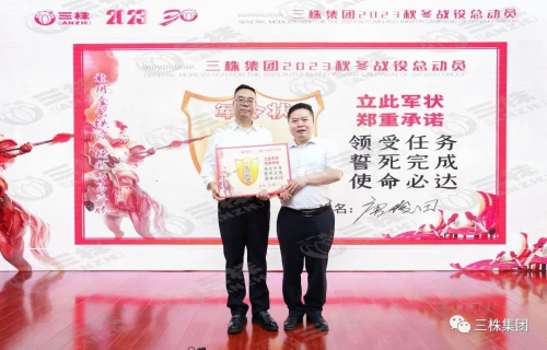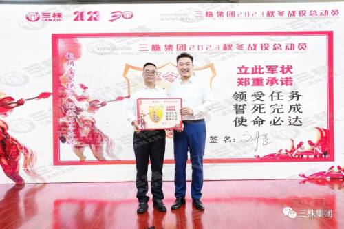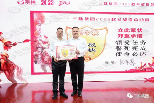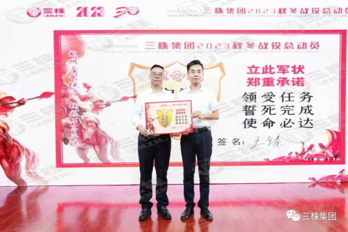 来自医药板块运营培训总监唐俊田;中医馆运营板块运营总监王臻;基地游板块新事业部拓展总经理唐甲森;线上运营板块运营总监刘佳;三株医院副院长高艳淑;生态美总裁冯淑霞等各营销板块负责人现场向李永顺总裁递交军令状,现场郑重承诺:领受任务、誓死完成、使命必达!必胜的呐喊响震全场。