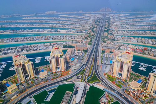 俯瞰目前世界上最大的沿海人工岛——棕榈岛,正如它的名字,从空中看下去,它就像一棵巨型的棕榈树,岛上建有住宅、酒店、主题公园等。