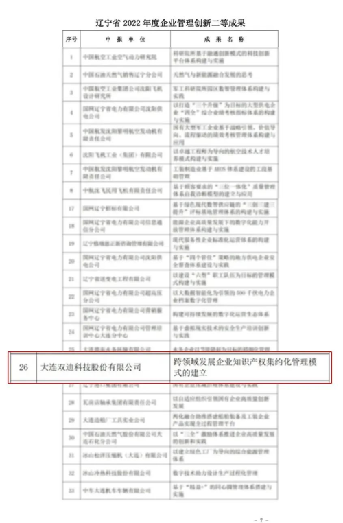 双迪获辽宁省2022年度企业管理创新二等成果
