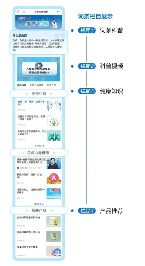 以“增强免疫力”词条为例,可以看到,在“增强免疫力”这一词条下方,相关的词条科普、科普视频、健康知识、产品推荐等栏目一应俱全。可以说,关于增强免疫力,你日常所需要了解的内容,都可以在这里找得到,满满的健康干货在等着你探索。
