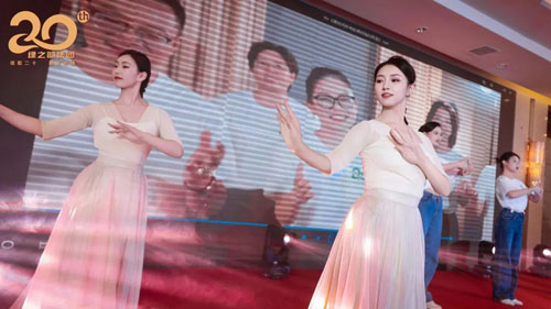 随后,一段绿之韵集团20周年纪念曲《愿世间所有的美好如约而至》现代舞表演为晚宴带来难忘瞬间,绿之韵舞蹈演员穿着有民族特色的服饰,以现代舞穿插手语舞的形式,展现了纪念曲的优美韵律和柔美风情。悠扬的歌声,饱含深情的歌词,将无惧岁月,把握当下,勇敢追逐梦想的绿之韵精神娓娓道来,同时也唱出了所有绿之韵人坚持活出真我,做更好自己的初心。