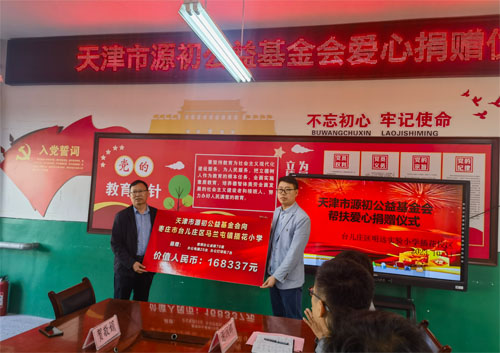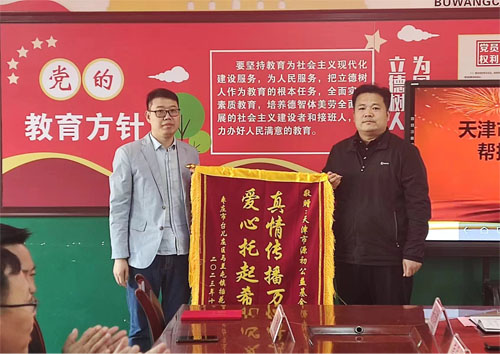 台儿庄区教体局党组成员、副局长徐浩同志向天津市源初公益基金会回赠了锦旗和捐赠证书。