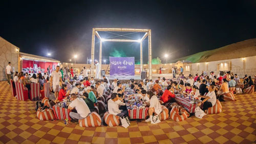 夜幕悄然降临,在具有阿拉伯独特风情的沙漠营地,开启了绿之韵人专属的特色风情晚宴,欣赏独特的阿拉伯音乐和肚皮舞表演,穿着阿拉伯民族服饰拍照,品尝阿拉伯特色的食物,绘制阿拉伯民族手绘,收获生日惊喜……仰望漫天星空,享受全身心的放松与自我。
