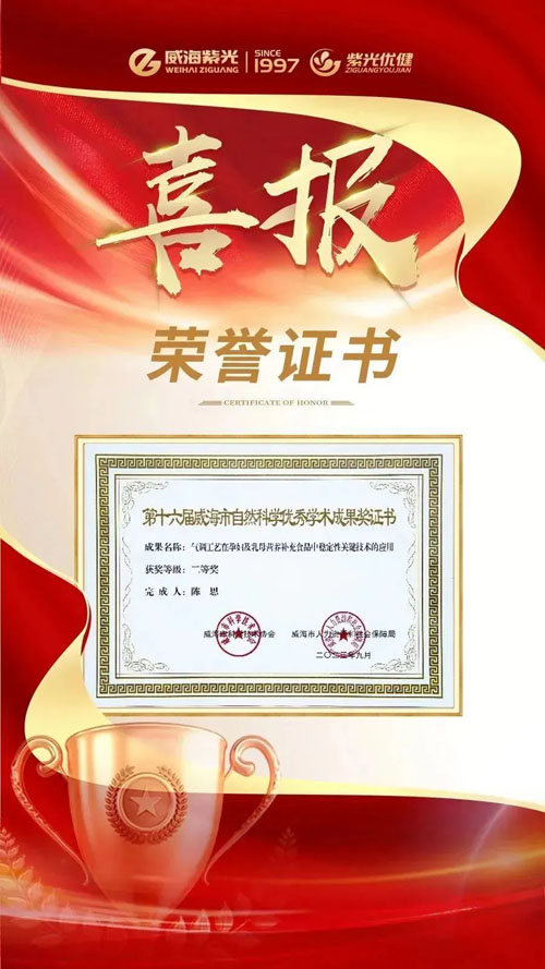 近日,威海紫光研发中心工程师陈思凭借研究项目《气调工艺在孕妇及乳母营养补充食品中稳定性关键技术的应用》获威海市自然科学优秀学术成果奖二等奖。