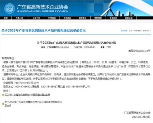 11月23日,广东省高新技术协会发布《关于2023年广东省名优高新技术产品评选拟通过名单的公示》。
