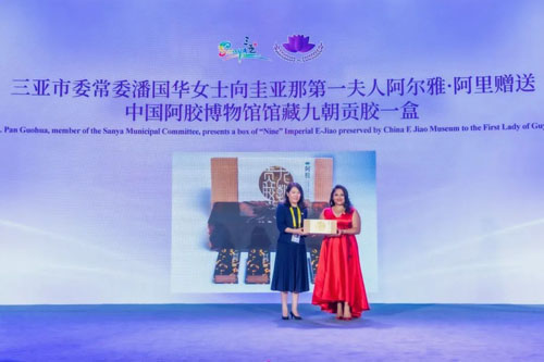 论坛以“她力量:共建·共享美好生活”为主题,中华全国归国华侨联合会副主席程红,中国人民对外友好协会副会长李希奎,三亚市委副书记、市长陈希,“一带一路”沿线国家驻华大使、第一夫人,优秀青年代表,企业界人士等各界人士出席论坛。华润医药办公室总经理任辉、战略管理部总经理孙金妮受邀参加。东阿阿胶副总裁李庆川以《开放中医药文化交流,共绘女性健康蓝图》为题作主题演讲,东阿阿胶旗下明星产品九朝贡胶、阿胶、复方阿胶浆等产品纷纷亮相。