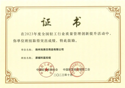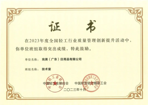 完美(广东)日用品有限公司技术室、扬州完美日用品有限公司质量管理部原辅料监控组被评为“全国轻工行业质量信得过班组”;