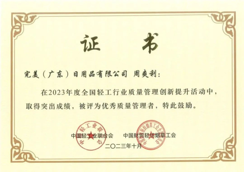 完美(广东)日用品有限公司周爽利荣获“优秀质量管理者”。