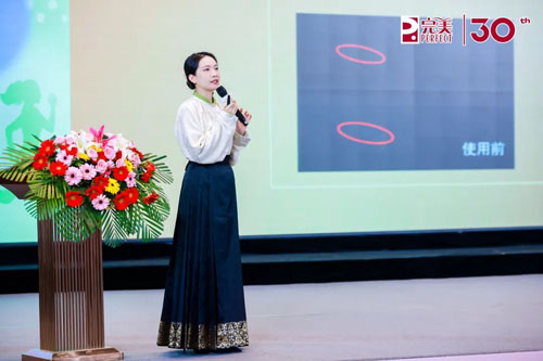完美公司业务中心推广部林颖主任,为大家带来臻荟珍萃凝时尊享护理套装和记忆花萃焕颜肌底液课程讲解,为这个飘雪的冬日注入源源暖阳。