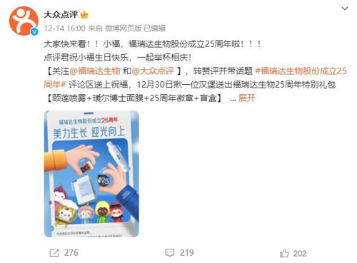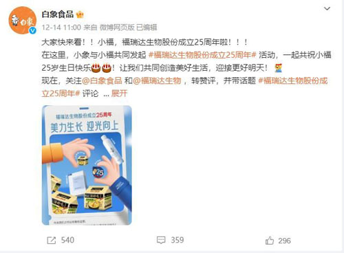 “大家快来看!!小福,福瑞达生物股份成立25周年啦!!!在这里,小象与小福共同发起 #福瑞达生物股份成立25周年# 活动,一起共祝小福25岁生日快乐!让我们共同创造美好生活,迎接更好明天!”。12月14-15日期间,包括白象、361°、大众点评、洽洽、上好佳等超过100家品牌微博祝贺福瑞达生物股份25岁生日,横跨食品、互联网、服饰、家居等不同行业,成为微博平台的一道靓丽风景线。