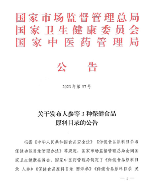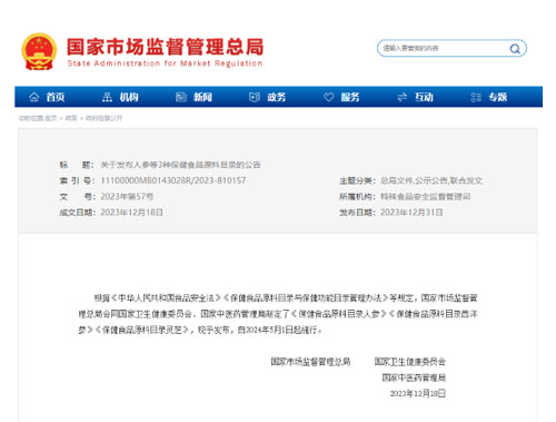 12月31日,市场监管总局发布《关于发布人参等3种保健食品原料目录的公告》。其中包括《保健食品原料目录人参》、《保健食品原料目录西洋参》和《保健食品原料目录灵芝》自2024年5月1日起施行。