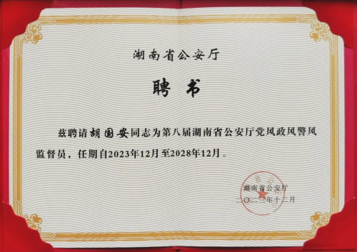 胡国安受聘为湖南公安厅党风政风警风监督员