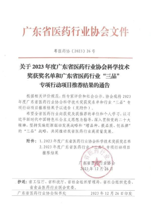 《关于2023年度广东省医药行业协会科学技术奖获奖名单和广东省医药行业“三品”专项行动项目推荐结果的通告》