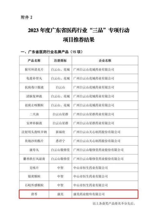 近日,广东省医药行业协会发布《关于2023年度广东省医药行业协会科学技术奖获奖名单和广东省医药行业“三品”专项行动项目推荐结果的通告》,康美药业旗下产品茯苓、广藿香分别获评“广东省医药行业名牌产品”及“广东省优质中药饮片”荣誉称号。