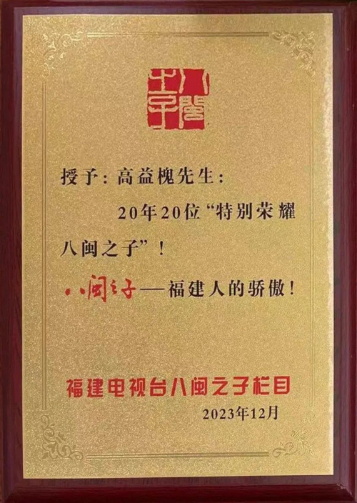 1月2日,由福建省电视台“八闽之子”栏目组主办的“庆祝八闽之子创办二十周年盛典晚会”在福建福州举行。盛典上,俄罗斯工程院外籍院士、新西兰科学院生物活性研究中心首席科学家、安发国际控股集团董事局主席高益槐教授被评为二十年来20位“特别荣耀八闽之子”之一,并作为代表致辞。前中国女排主教练陈忠和先生、航天神舟五号火箭总指挥黄春平先生等400多位各界精英人士出席盛典。