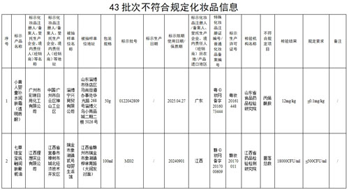 在2023年国家化妆品抽样检验工作中,经山东省食品药品检验研究院等单位检验,产品标签标示为小黄人婴童补水润肤霜(透明质酸)、片仔癀牙敏舒牙膏(舒润薄荷)、竹盐固齿源固齿牙膏(炫彩清爽)、汉邦染发膏3.0、雪颜秘笈祛痘珍贵水、丝飘香阁留香顺滑洗发乳、CAVILLA睫毛精华液等43批次化妆品不符合规定(见附件)。