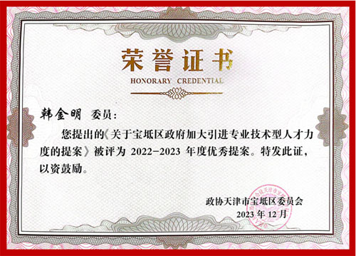 宝坻区政协副主席王云代表政协天津市宝坻区第六届委员会常务委员会作了关于提案工作情况的报告。韩金明董事长提出的《关于宝坻区政府加大引进专业技术型人才力度的提案》,被评为2022-2023年度优秀提案。