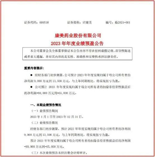 1月19日,康美药业发布《康美药业股份有限公司2023年年度业绩预盈公告》。《公告》表示,经财务部门初步测算,预计2023年1月1日至12月31日期间康美药业实现归属于母公司所有者的净利润9000万元到13500万元,与上年同期相比,将实现扭亏为盈。