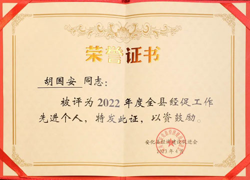 经促联谊,情系家乡。2023年4月4日,安化知名乡友助力乡村振兴恳谈会暨2023年安化县经济建设促进(商会)工作会议召开。凭借着在过去一年中在全县经促工作中的突出表现,胡国安会长被评为“2022年度全县经促工作先进个人”,长沙市安化商会被评为“2022年度全县经促工作先进分会”。