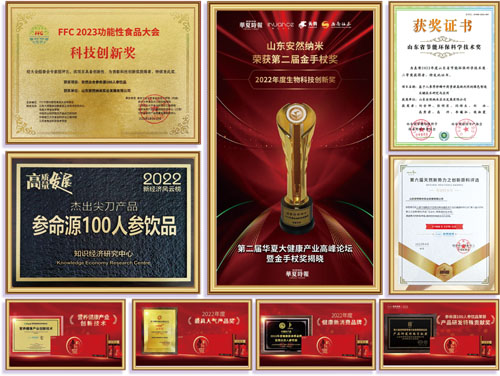 参命源100人参饮品荣获2023创客中国·口碑产品奖、FFC2023功能性食品大会科技创新奖、2022年度生物科技创新奖、山东省节能环保科学技术奖、源创技术奖,安然参命源100人参饮品荣获杰出尖刀产品、2022年度健康新消费品牌大奖、营养健康创新技术、2022年度最具人气产品奖、产品研发特殊贡献奖等众多殊荣。