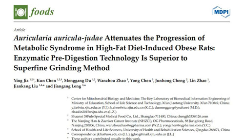相关成果由校企联培博士生贾莹(第一作者,企业技术人员)、陈坤(共同第一作者,企业技术人员)、杜孟刚(第二作者,企业技术人员)、赵琳、成俊宏(企业指导教师)、龙建纲教授(通讯作者,学科指导教师)和刘健康教授(共同通讯作者,学科指导教师)等多位研究人员合作完成。在foods发表题为“Auricularia auricula-judae Attenuates the Progression of Metabolic Syndrome in High-Fat Diet-Induced Obese Rats: Enzymatic Pre-Digestion Technology Is Superior to Superfine Grinding Method”的研究论文。