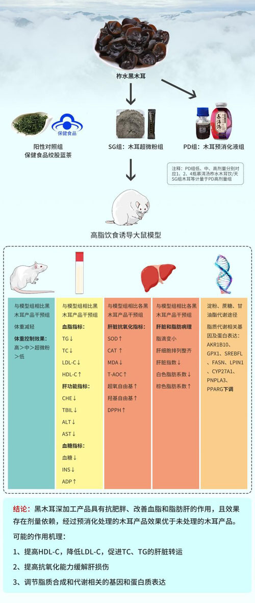 在该研究中,采用超微粉碎(SG)和酶促预消化(PD)两种不同的工艺对柞水黑木耳进行预处理(SG工艺是将柞水黑木耳经多功能破碎机粗碎,再使用气流粉碎机粉碎至500目;PD工艺是将柞水黑木耳超微粉加入水中溶解,在适宜的温度和pH下依次经几丁质酶、纤维素酶、果胶酶等按照特定比例酶解)。分析不同加工工艺生产的黑木耳产品的基本营养成分,建立高脂血症大鼠模型,比较不同生产工艺的黑木耳产品在高脂饮食诱导大鼠血脂异常脂质调节的效果,测量血清血脂和肝脏中的相应指标,对肝脏及脂肪进行病理检测,进行转录组测序分析,分析肝脏中参与脂肪酸合成和代谢的几个必要生物标志物的mRNA基因和蛋白表达。