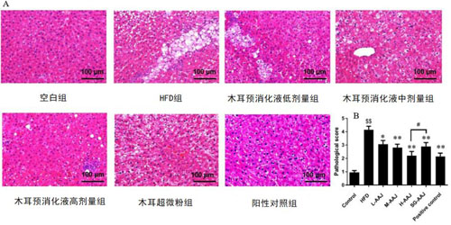 黑木耳产品干预组血脂、血糖及肝功能指标结果显示:黑木耳干预组均能够抑制由HFD引起的大鼠血脂异常,降低大鼠血清胆固醇、甘油三酯、低密度脂蛋白水平,提高密度脂蛋白,降低血糖,改善肝功能,提高脂代谢紊乱大鼠肝脏抗氧化能力。