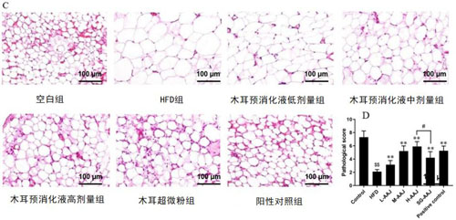 根据肝脏及脂肪病理分析结果显示,HFD组中大鼠肝细胞出现大量脂肪空泡,部分脂肪空泡合并形成气球样变性,肝脏也可见散发细胞结节,模型组出现脂肪肝症状。在给予黑木耳产品干预后,脂滴明显小于模型组,同时较大脂肪细胞比例下降,大鼠肝细胞排列也更加整齐,提示肝脏脂质沉积得到缓解,该现象呈剂量依赖性,预消化液高剂量组减少脂肪累积能力最强。本研究进一步通过转录组学测序,发现黑木耳活性成分通过调控肝脏脂质代谢基因发挥降脂作用。