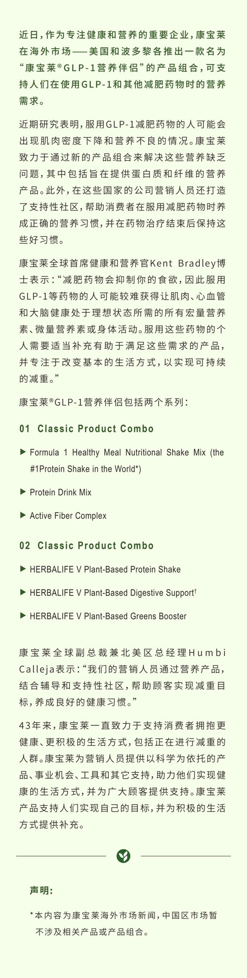 针对GLP-1 康宝莱海外市场推出营养伴侣