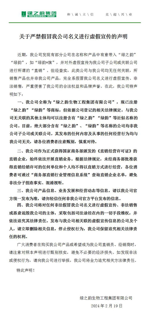 绿之韵声明:严禁假冒公司名义进行虚假宣传