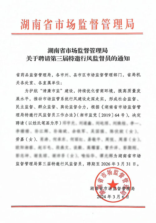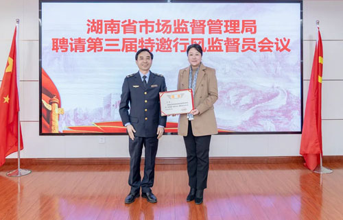 劳嘉总裁被续聘为湖南省市场监督管理局第三届特邀行风监督员
