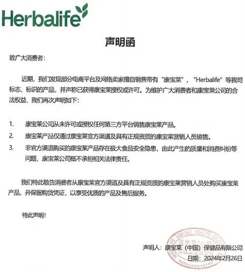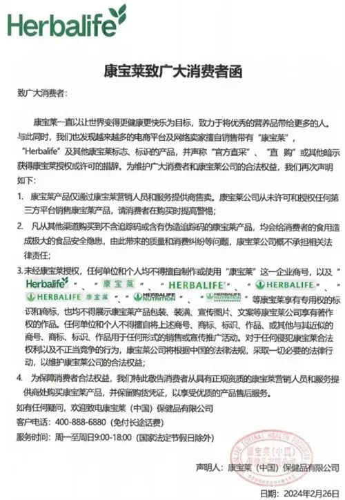 渠道保护是康宝莱维护消费权益的重要举措之一,通过不断有效的打击,全网康宝莱产品销量连续三年下降,同时,2023年全网平台移除或关闭销售康宝莱产品店家超过100家。至此315即将到来之际,康宝莱重磅发布最新《声明函》及《康宝莱致广大消费者函》,敬告消费者,从官方渠道购货,保障消费权益。