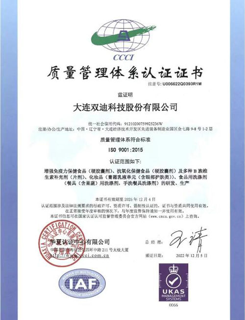 双迪秉承“百分之一的缺陷就是百分之百的否定”产品质量观,为消费者提供放心满意的产品,公司按照新版GMP标准建立生产基地,严格执行ISO9001质量管理体系、ISO14001环境管理体系、ISO45001职业健康安全管理体系认证,牢牢把住质量关。