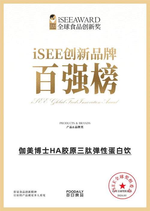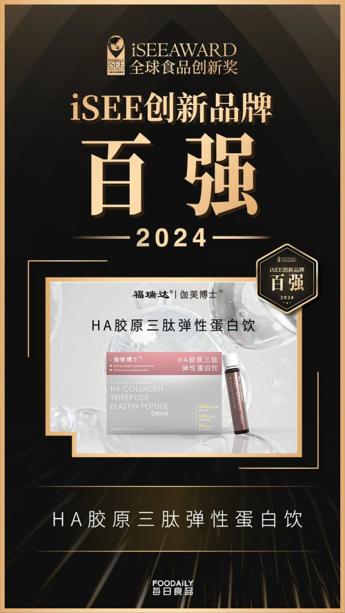 近日,福瑞达旗下品牌伽美博士产品“HA胶原三肽弹性蛋白饮” 荣登“iSEE全球食品创新奖”产品&品牌类百强榜。