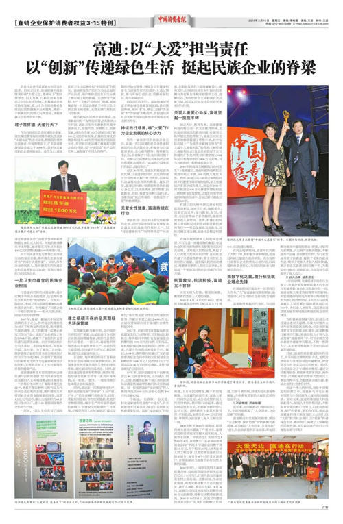 3月15日,《中国消费者报》发刊《2023直销企业保护消费者权益3•15特刊》,对直销企业保护消费者权益的事迹进行了报道。其中,以《富迪:以“大爱”担当责任 以“创新”传递绿色生活 挺起民族企业的脊梁》为题,特刊对富迪进行了整版长篇报道。