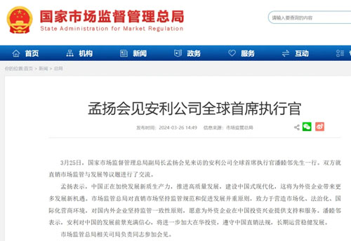 3月25日,国家市场监督管理总局副局长孟扬会见来访的安利公司全球首席执行官潘睦邻先生一行。双方就直销市场监管与发展等议题进行了交流。