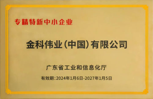 经广东省工业和信息化厅审查评选,金科伟业(中国)有限公司被评定为“专精特新”中小企业,有效期:2024年1月6日至2027年1月5日。