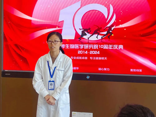 随后,生物信息部部长孙麟、院长助理楼敏铭、生物制剂部部长张硕分别发言。孙麟部长介绍了研究院党支部自成立以来坚定四个自信,提高四个意识,坚持五位一体高质量发展,并认真贯彻落实到研究院日常工作中。院长助理楼敏铭博士作为员工代表,见证了10年来研究院的成长壮大,与现场诸位进行了充分的交流分享。生物制剂部部长张硕对研究院的主要科研项目给出了专业而又详实的成果汇报,获得了在场人员的一致认同。