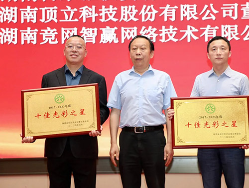 湖南省工商联二级巡视员谢明亮为胡国安理事长颁发“十佳光彩之星”荣誉奖牌