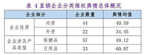 如果按照其这组数据进行分析,那么每一家直销企业的舆情均数应该是“25978/66”,经过计算这一均数是393.6条。但是《报告》给出的数据如下表,内资舆情均值49.59条,外资舆情均值为34.45条,这个均值差距近10倍。造成这一差距的原因就在于《报告》的范围界定不清,将许多非直销行业的舆情统计进了报告,这造成了数据的统计误差极大——10倍左右!