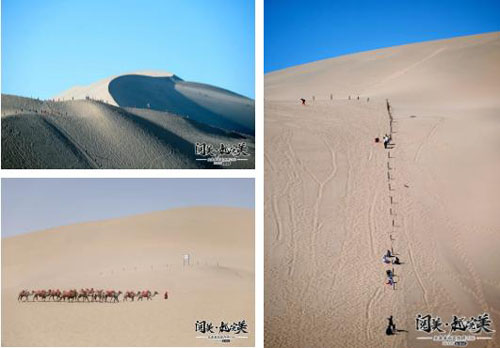 “天下第一泉”月牙泉被称赞为塞外风光一绝,泉似弯月置身鸣沙山中,像上帝遗留在沙漠的珍宝。完美佳人们闻着悠悠驼铃,穿过茫茫沙漠,一睹沙泉相依奇观。大家在这里留下了黄沙靓丽,也留下了对完美三十周年的真诚祝福,龙腾三十,马到功成!