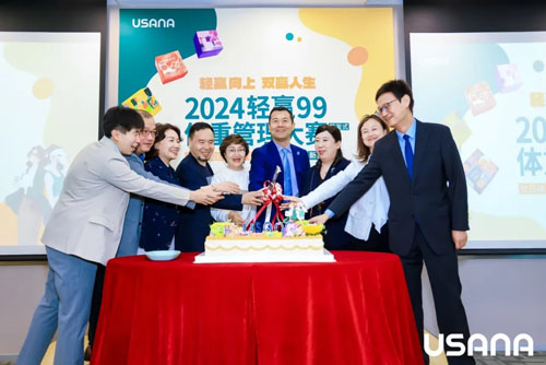在活动的结尾,USANA葆婴高管们一起上台,切下象征着“健康、营养、收获甜蜜喜悦”的蛋糕,共同庆祝“2024轻赢99体重管理大赛”首发,以及优莎纳蛋白营养粉系列和膳食纤维粉全新上市!