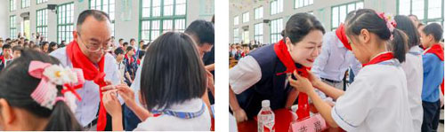 学生代表为领导嘉宾佩戴红领巾、送上鲜花