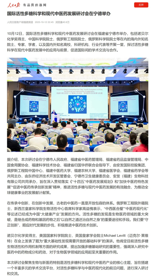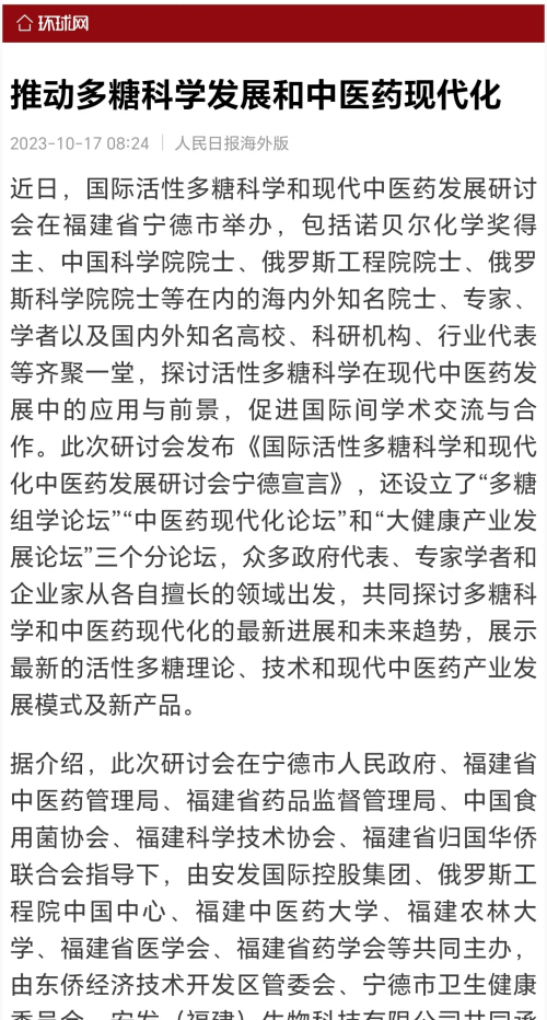 2023年,安发联合主办了国际活性多糖科学和现代中医药发展研讨会。此次研讨会汇聚了包括诺贝尔化学奖得主在内的九大院士及众多知名专家聚而论道,取得了丰硕的成果。研讨会规模盛大、内容丰富、影响广泛,吸引了人民日报(人民网)、新华社(新华网)、中国新闻社(中国新闻网)、中国网、光明网、中国青年网、中国经济网、环球网、中宏网等众多主流媒体的广泛报道,至今仍被行业内外众多人士津津乐道。应众多业内同仁和关注者的要求,安发生物今天与大家一同系统回顾这场研讨会的精彩盛况——