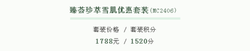 活动期间,限量推出臻荟珍萃雪肌优惠套装(MC2406),内含臻荟珍萃雪肌新品六件套,尊享1788元上市优惠价,一套劲省472元!套装数量有限,售完即止。