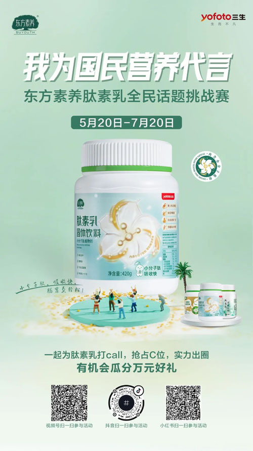 5月20日至7月20日,在三生官方视频号、抖音、小红书话题页参加#我为国民营养代言东方素养肽素乳全民话题挑战赛,秀出花式打call视频/图片,就能成为国民好营养的“代言人”,更有机会瓜分万元好礼。